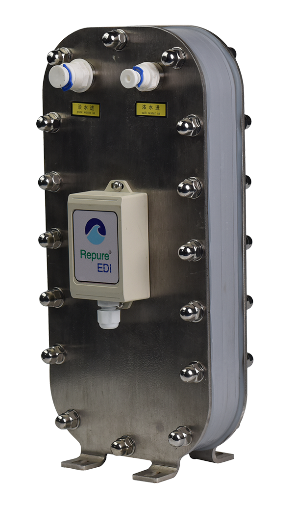 EDI(Elcctrodeionization)是一種將離子交換技術(shù)、離子交換膜技術(shù)和離子電遷移技術(shù)相結(jié)合的純水制造技術(shù)。它巧妙的將電滲析和離子交換技術(shù)相結(jié)合,該項(xiàng)技術(shù)的發(fā)展克服了離子交換樹脂的局限性,利用兩端電極高壓使水中帶電離子移動(dòng),并配合離子交換樹脂及選擇性樹脂膜以加速離子移動(dòng)去除,從而達(dá)到水純化的目的。在EDI除鹽過程中,離子在電場作用下通過離子交換膜被清除。同時(shí),水通過一個(gè)或多個(gè)在陽離子或陰離子選擇膜之間填滿離子交換樹脂的管腔,在電場的作用下,離子在離子交換樹脂間向管腔的兩側(cè)移動(dòng)并進(jìn)入另外的管腔,這個(gè)過程中也會(huì)電解產(chǎn)生維持樹脂處于再生狀態(tài)所需的H+和OH- 。流向兩側(cè)獨(dú)立管腔的離子被水沖刷掉。
